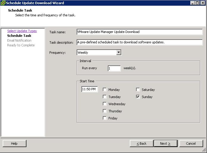 Schedule the updates to run weekly at a time of low activity on the Virtual Center server, I chose Sunday nights near midnight.